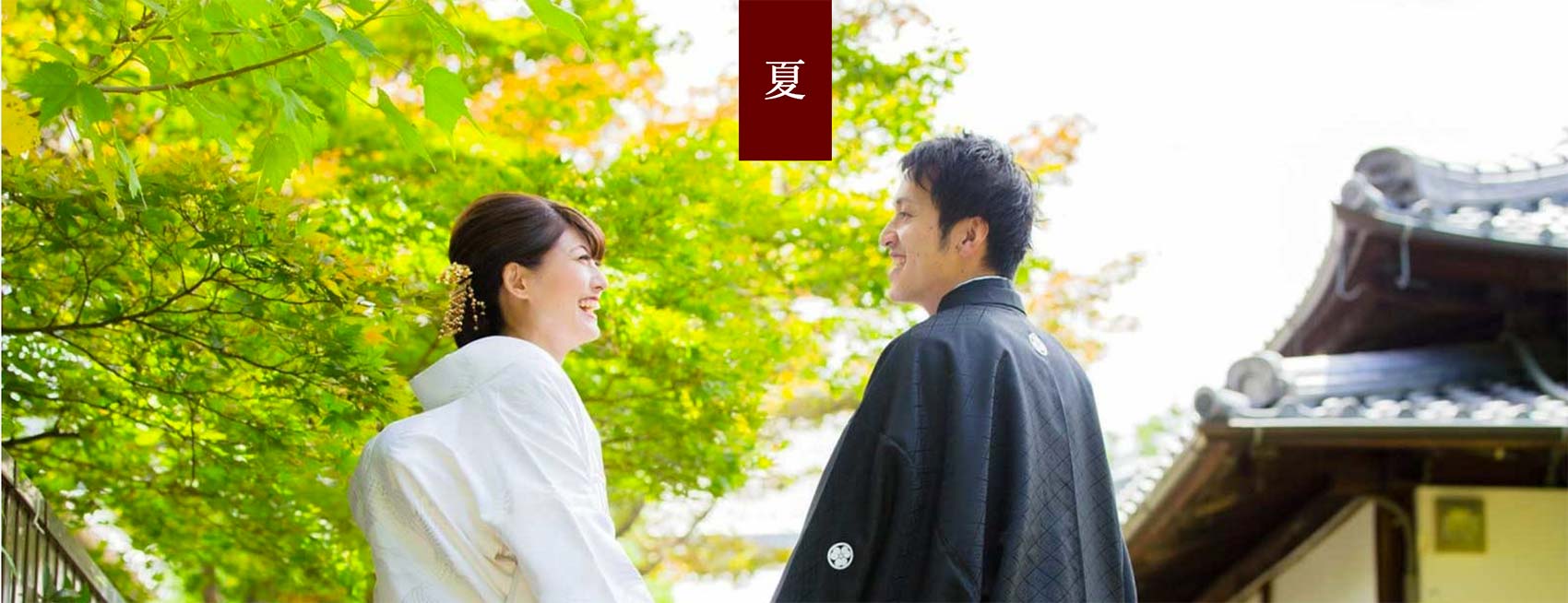 新緑の季節から夏までは撮影場所にある青紅葉が美しく太陽の光を透過させます。お写真映えがよく、皆様爽やかなお写真の仕上がりになっています。